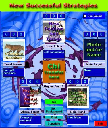 Into the blue fields below the positions, you can qualify and describe exactly what you want to happen. The "alternate target" position was used in this design to expand the trend. Once the operation is set up, you can click the “Start” button and the transfer image starts moving from position to position, merging with each of the images in the positions. To gain experience, first test as many operations as possible and adjust them to your needs by putting the right wording into the blue boxes and exchanging some of the ikons by clicking on the image positions and installing new ikons. After having gaines this initial experience, you can start designing your own operations. Later you can install additional ikons. After setting up an operation, run it for about two hours. Then with the "thought form" or set of solidified abstractions operating, wait for a couple of days. Then repeat the operation, perhaps adjust a bit to the changing situation. If no inroads at all, change your success strategies and, based on this, set up an operation reflecting a new success strategy. |