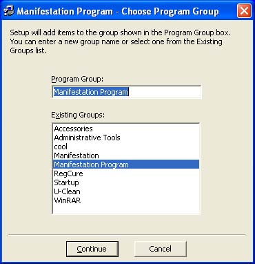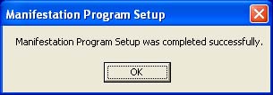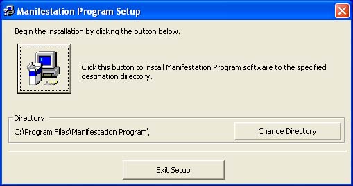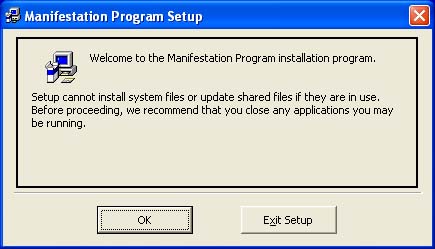 As pointed out above, you received your Manifestation program with a transfer diagram. Put the hard copy on your Chi Generator® or next to it, while the .jpg image of the transfer diagram is running in your program. This transfer diagram operates as a structural link between program and Chi Generator®. You can establish a structural link from the program to yourself by connecting to the Chi Generator® with one of the the Transfer Couples, such as the TC 99, the PBT 69, the RAOPTC or the Chi-Card. (A) A step-by-step introduction to the installation and setup of this program. At first, install the program iteslf, following the instructions after you insert the Manifestation CD. Then you will install the images and sound files, and finally you are going to are install of the Chi Transfer diagram, target photos of your choice (if desired) and additional background images, sounds and action-ikons (images representing actions). 1. Insert Disk - the following popup window appears.