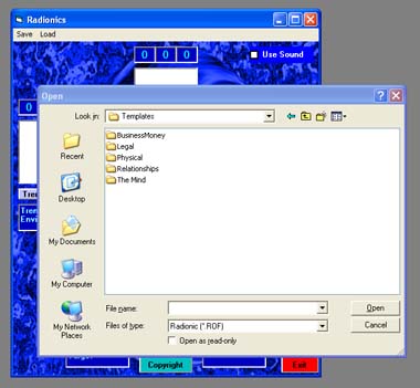 (B) Setting up the program for specific operations Click the “Start” button and the startup screen will appear. This screen has all six positions showing. This program had 5 fixed positions in pentagram-arrangement, for each of which you can indicate the function in general and add a description of the desired effect or target of the operation in particular. The sixth position is in the center of the star, and there you install the structural link, or Chi Transfer diagram. The program comes with Starter Templates as examples. These templates work only when it finds the images in the correct folder, which is the case if you followed the instructions above. At the beginning, it is good to start with a pre-designed Template. First, load an operation the following way: Click "Load" on top. A popup window appears