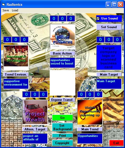 Into the blue fields below the positions, you can qualify and describe exactly what you want to happen. The "alternate target" position was used in this design to expand the trend. Once the operation is set up, you can click the “Start” button and the transfer image starts moving from position to position, merging with each of the images in the positions. To gain experience, first test as many templates as possible and adjust them to your needs by putting the right wording into the blue boxes and exchanging some of the ikons by clicking on the image positions and installing new ikons. After having gaines this initial experience, you can start designing your own operations. Later you can install additional ikons. After setting up an operation, run it for about two hours. Then with the "thought form" or set of solidified abstractions operating, wait for a couple of days. Then repeat the operation, perhaps adjust a bit to the changing situation. If no inroads at all, change your success strategies and, based on this, set up an operation reflecting a new success strategy. To the left, you can see several specific setups of operations that you will find in the templates of the weight management manifestation program. |