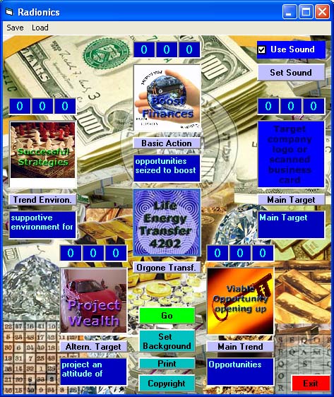 (1) a position for a basic energy ("Basic Action") setting that boosts the trend-to-target connection with the optimal energy field of a general nature that fits best the purpose of the advanced life energy operation. You can get an idea as to what you can do when looking at the examples and templates. (2) a position allowing you to set up a trend energy that is exerting an influence upon the environment of the target, which is facilitating a more rapid overall succes, and (3) a position designed to generate a link, or projection, to an alternate target. Whenever indicated, you can use this alternative target position as a "grounding function." As such it is designed to prevent repercussion to the operator (yourself) in the event when the trend energy cannot reach the envisioned target for reason of interference, blockage, etc. (4) a position for life energy transfer, the purpose of which is to energize the Manifestation Program: each program comes with an individual transfer diagram, or structural link: The connection with the program is a .jpg file, which you set up into the "orgone transfer" positions, The connection with the Chi generator® is a laminated card, which you put close to your device. Consequently, you can gain the ultimate flexibility: Your Chi generator® can be on one continent, for instance in your home or business location, your program can be on your laptop that you carry with you when travelling, even on another continent, and the target(s) of your operation can be on a third continent. In fact, you can run several programs simultaneously, whenever the need arises. How many simultaneous operations you can perform depends mainly on the amount of life energy that your Chi generator® produces. Naturally, with an HD device, you can perform three to four operations simultaneously. Important: Whenever you run several operations simultaneously, you should set up an additional operation, with the same transfer diagram, into which you enter under "target": all targeted persons/businesses of the simultaneous operations; and under "trend" you enter: equal distribution of life energy. You may or may not put any images into these positions, and you can leave the other three positions empty. For simultaneous operations, the ATG 5 or better yet the ATG 12 are ideal Chi generators®. With the ATG12 you can run up to 12 simultaneous manifestation operations full power !!! You find these extremely important settings only in our Manifestation Programs !!! You