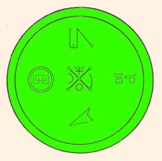 DESIGNING A PLANETARY TALISMAN Now you are ready to design your planetary talisman. For this purpose, you take paper or, better, cardstock. The color of the cardboard or paper should ideally be the color of the planet. Or you may use white cardboard and draw with a pen that has the color of the planet. Ideally, the pen should be new. What you are doing now is actually not making the talisman(s), which would require a ceremonial set up and some other observances. For now, you decide how to arrange the symbols of the talisman. In other words, you practice. In the following, I will give you the arrangements, front and back, of each planetary talisman. You are not required to follow exactly the same pattern, but as you progress in your skills, you will make the decision what symbols you chose and how they should be arranged on the talisman. Typically, a planetary talisman has two sides. One side has the numeric square (magical square) of the planet, while the other side contains the various characters, seals, names, etc., of the planet. Let's proceed step by step in a situation where you are asked to make a talisman. Let's now imagine that somebody comes to you who wants success in love. What planetary talisman would you make for that person: VENUS, of course. To make the talisman, you may wait for a FRIDAY, which is the day of VENUS, and you may even wait for the hour of Venus. But about timing later. For now it is important that you set yourself up to make the talisman. What metal would you choose - if you make a metal talisman? The metal of Venus is COPPER. This course will not teach you how to etch metal. If you do not know how to etch or if you have two left hands as far as skills in arts and crafts are concerned, you can make just as good a talisman on cardboard that you may laminate or, better, real parchment. Parchment has a unique color. Therefore you will decide for your pen to have the color of Venus, which is GREEN. So what